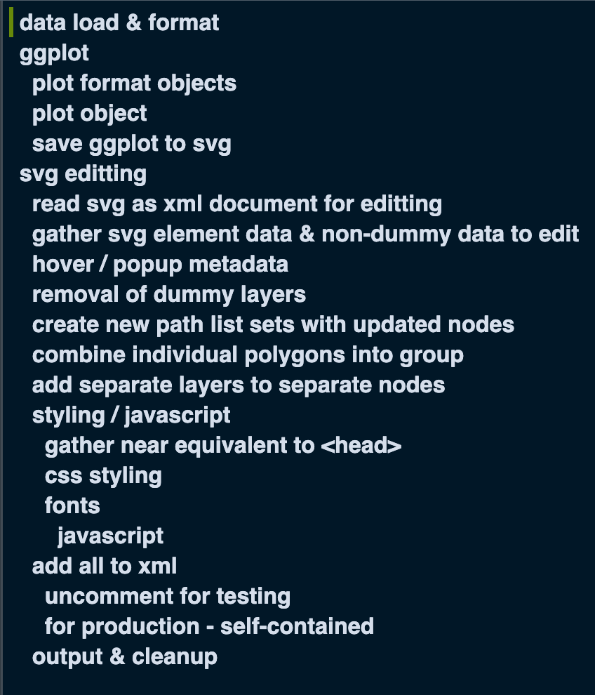 Combining all of these techniques involves quite a bit of prototyping. There’s a lot to pick apart, especially with mapping elements of the ggplot to the svg output correctly. Figure 3 displays an outline of the core components of the script. You can dive deep into the full script below. I originally built this to add within the about page/path of my site, so this is why paths are relative to the about/ directory.
