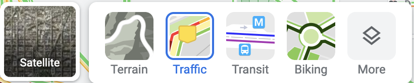 Combinations of raster tiles on a web map can be thought of as a layer. Additionally, specific types of vector tile data can be split into layers as well. Figure 2 shows the different layers that can be selected from within Google Maps. The “Traffic” layer is a vector layer, whereas the “Satellite” layer is a raster layer made up of mosaiced satellite imagery.