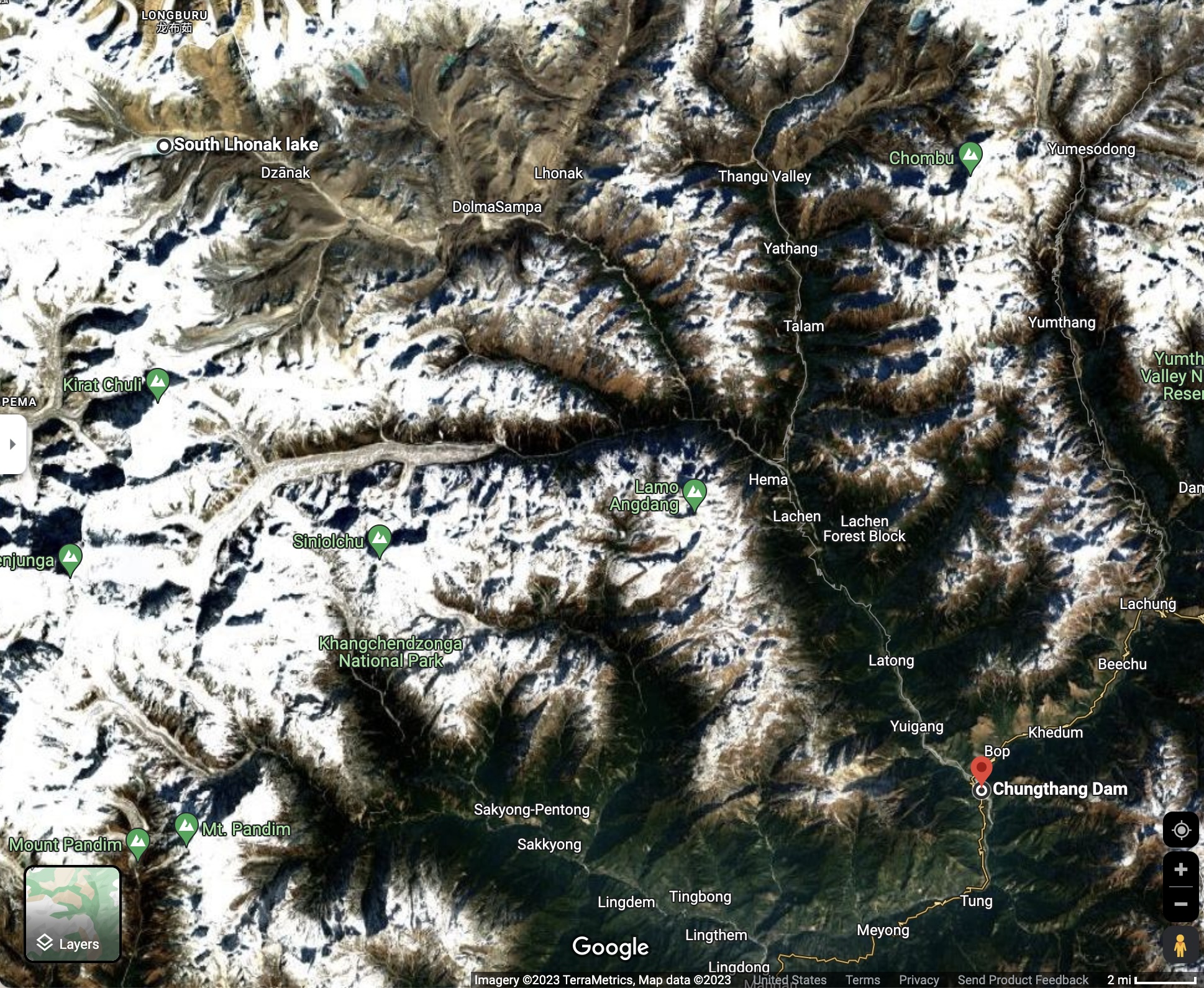 Figure 2: Google Maps view from South Lhonak Lake (upper left) to Chungthang Dam (bottom right). Source